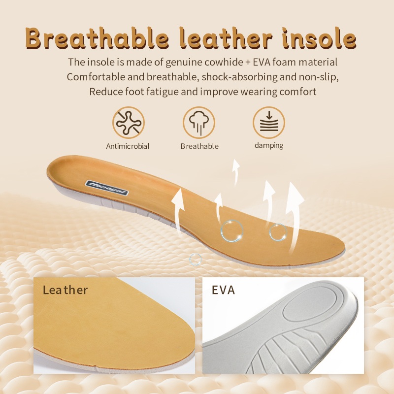 Оригинална говедска кожа + влошка од пена EVA - дише, амортизира и не се лизга. Одржува свежо чувство на стапала милја по милја.
